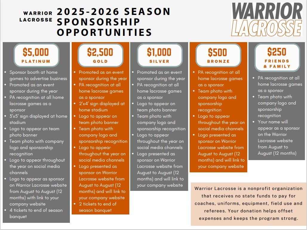 Thank you for your support of the Warriors lacrosse program, it is greatly appreciated!